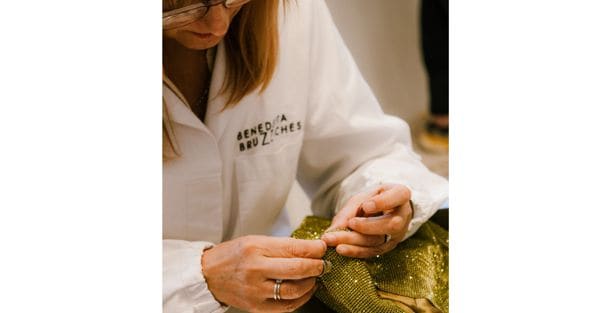 Era il 2009 quando Benedetta Bruzziches – un diploma allo Ied di Roma, un’esperienza nell’ufficio stile di Romeo Gigli, un viaggio rivelatore nelle manifatture di borse dell’India – insieme al fratello Agostino decise di correre il rischio di riportare in vita la filiera delle confezioni locali. «Nel 2017, poi, a una fiera ho trovato un materiale meraviglioso, una maglia di cristalli, e ho capito che sarebbe funzionato benissimo per le borse che avevo in mente. Ma serviva chi sapesse confezionarle, a mano. Per questo, poco alla volta, parlando con le persone della zona ricche di esperienza e competenze ma rimaste senza lavoro, ho pensato di farle fare a loro»: Benedetta Bruzziches parla nella sua Bottega Bruzziches, la nuova manifattura inaugurata nella zona industriale di Caprarola, cuore della sua filiera speciale composta oggi da decine di sarte della zona che ricevono i kit per cucire le borse.