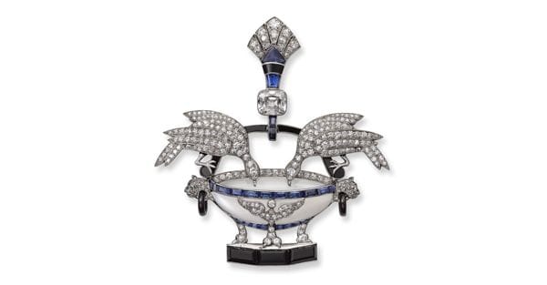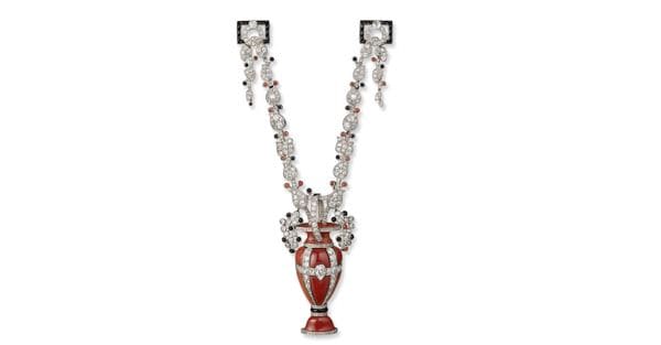 Certo, alcuni rimandi sono più espliciti (gli orologi collocati nella Sala dei filosofi, il collier come il torque del Galata morente, le ghirlande di un cratere del I secolo riprese su un sontuoso devant de corsage), ma l’emozione del percorso scaturisce dal sentire che nei gioielli si nasconde il mito e il segreto delle origini dell’umanità, scintilla cosmica e insieme mistero sotterraneo. Come tali, canali di espressione del «tempo come immagine mobile dell’eternità» (Platone nel Timeo), sono anche strumenti per fingersi divinità: Livia Drusilla, come prima imperatrice anche prima donna divinizzata dell’era augustea, in un busto che apre la mostra indossa una corona di spighe come Cerere, incredibilmente simile alla vicina tiara dove le stesse infiorescenze sono di platino e diamanti. Nel 1907 Maria Bonaparte, discendente di Napoleone, per le nozze con il principe Giorgio di Grecia commissionò a Cartier una tiara con foglie di ulivo e perle, le prime rimando ad Atena, le seconde simbolo di nobiltà e purezza.
